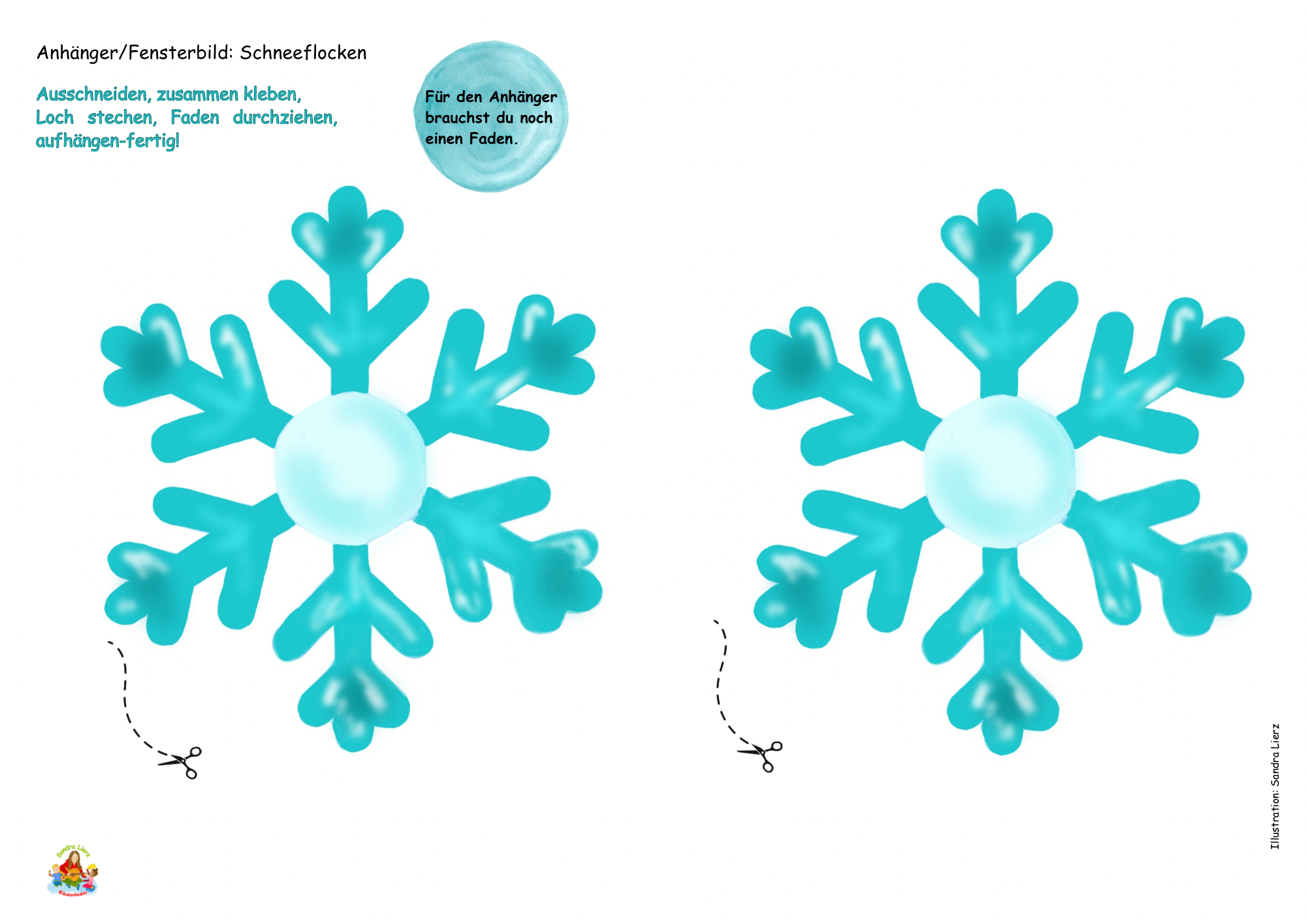 Ein Arbeitsblatt mit 2 handillustrierten Schneeflocken (Spiegelverkehrt) zum ausschneiden und gestalten.
