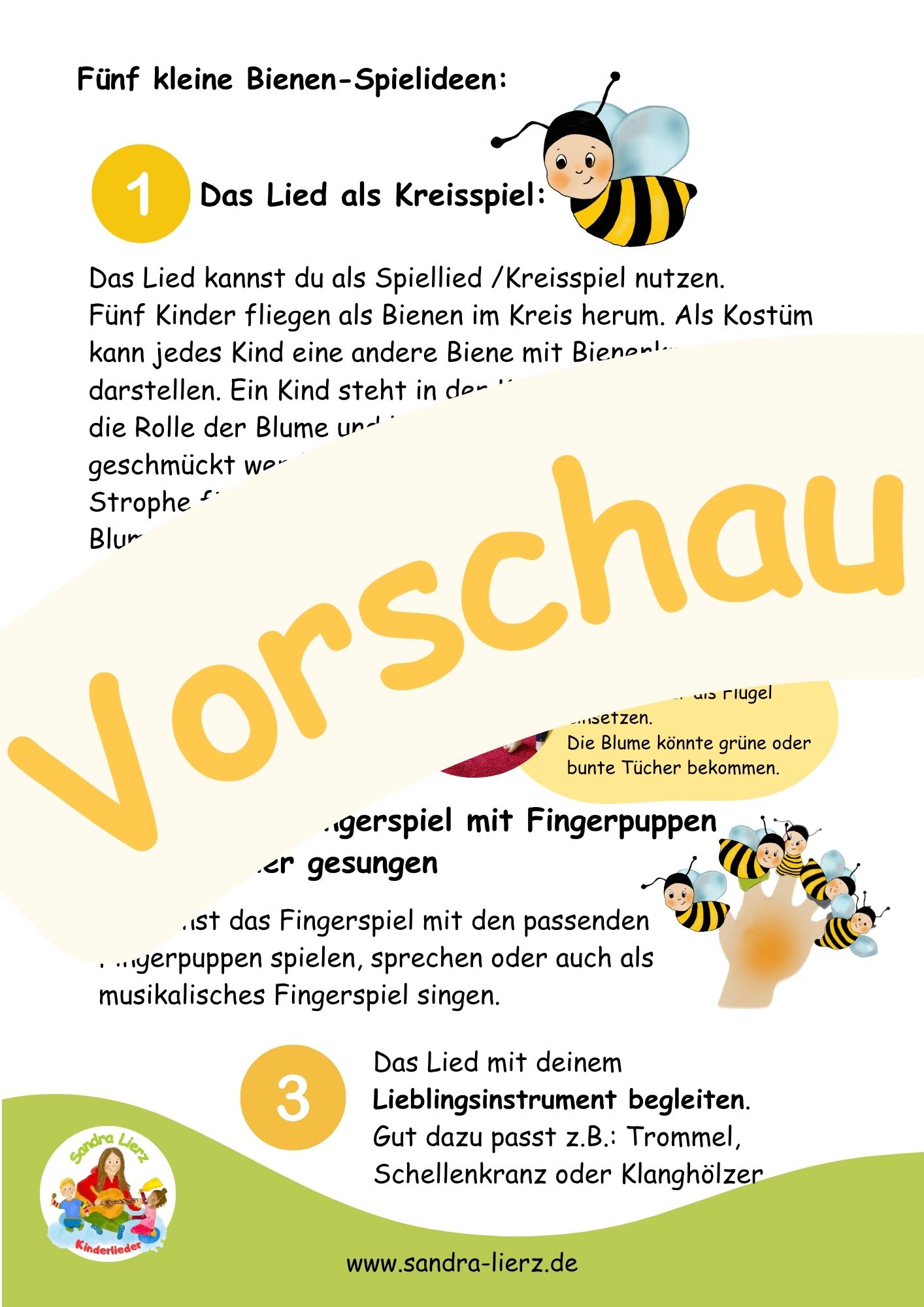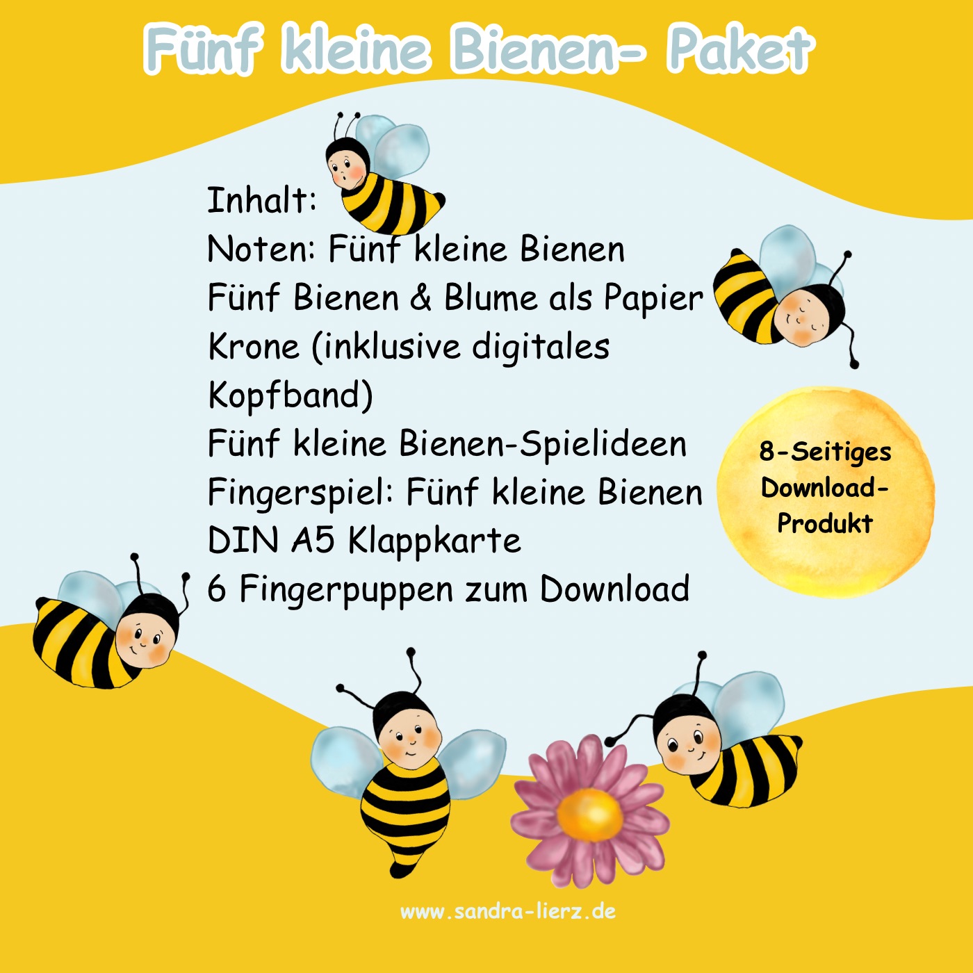 Mit diesem musikalischen und kreativen Bienen-Paket können die Kinder gleich in die Rolle der Biene und Blume schlüpfen. Das enthaltene Fingerspiel „Fünf kleine Bienen“ kann mit passenden Bienen-Fingerpuppen gesprochen oder auch gesungen werden. Dazu gibt es eine praktische DIN A 5 Klappkarte mit dem Text für deine Praxis. Die passenden Noten zum Lied „Fünf kleine Bienen“ findest Du natürlich auch im Paket. Da sich das Lied auch sehr gut als Kreis-Spiellied eignet, findest du dazu fünf süße, handillustrierte Bienenkronen & Blumenkrone alles zum Download. Zusätzlich gibt es noch Ideen zur praktischen und musikalischen Umsetzung.