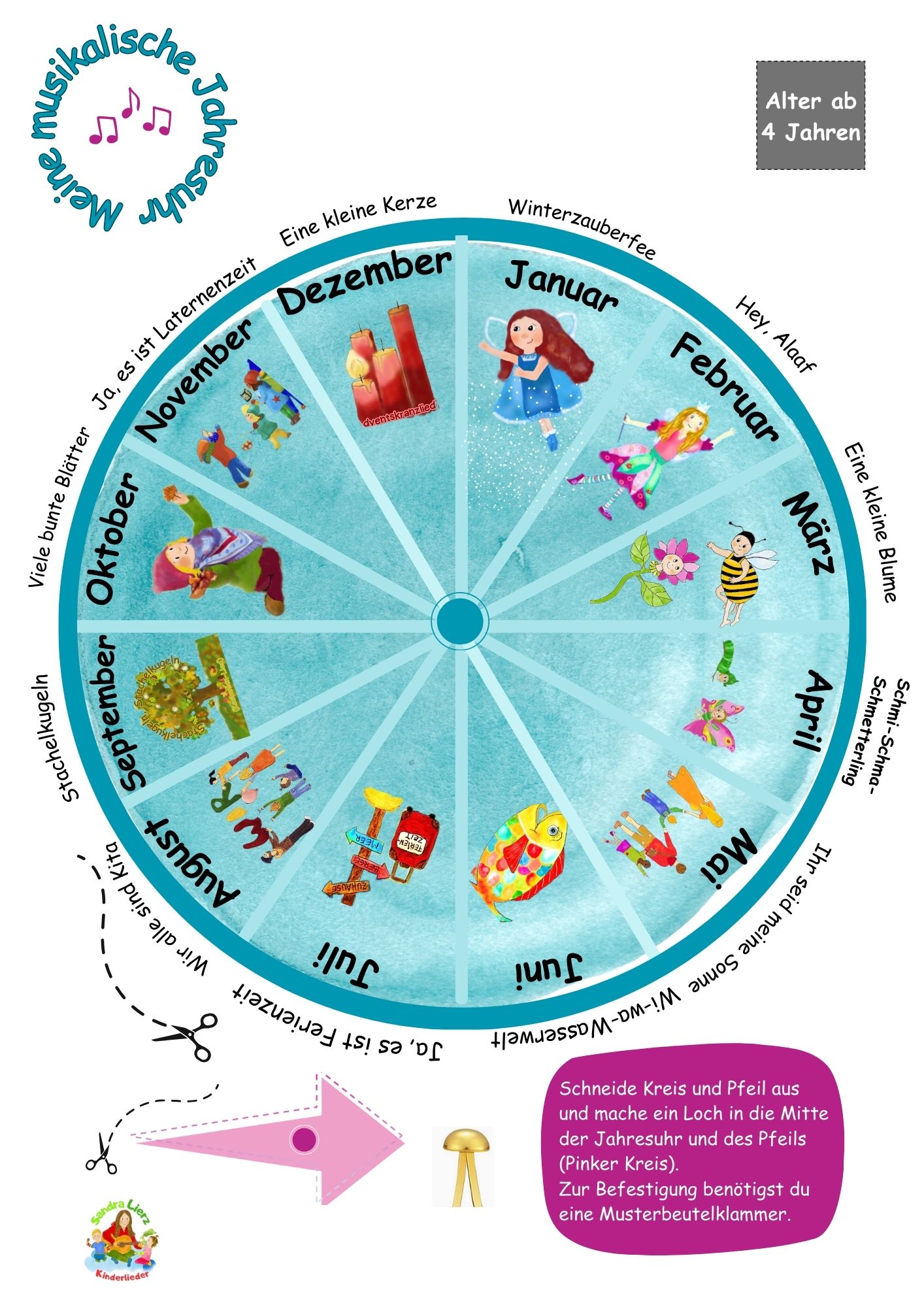 Außerdem beinhaltet das Paket eine musikalische Jahresuhr zum ausdrucken und fertig basteln, sowie ein weiteres Arbeitsblatt, um Monat für Monat die neuen Lieder aus der Jahresuhr zu verbinden.