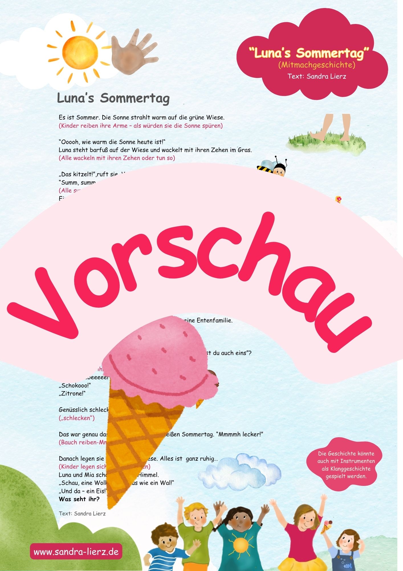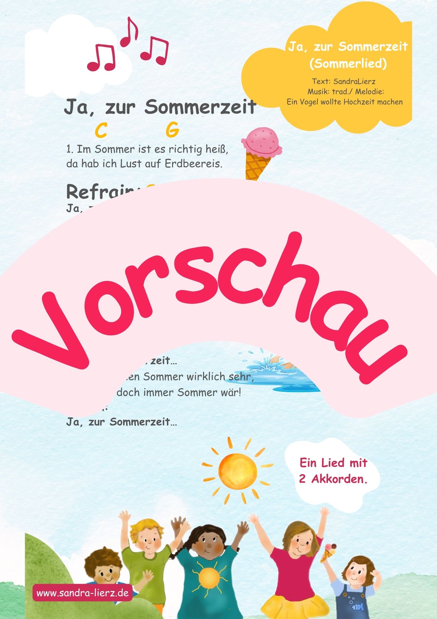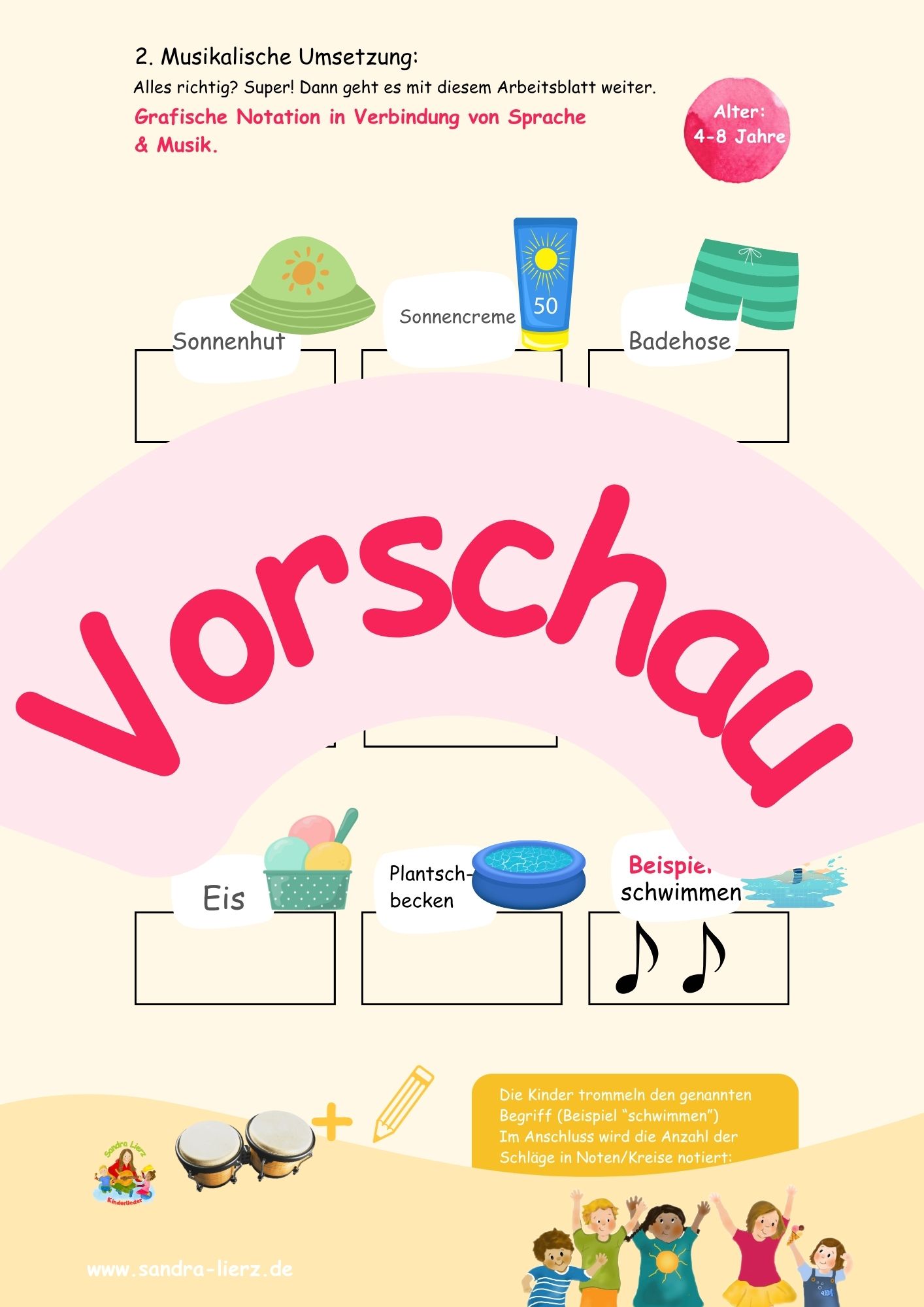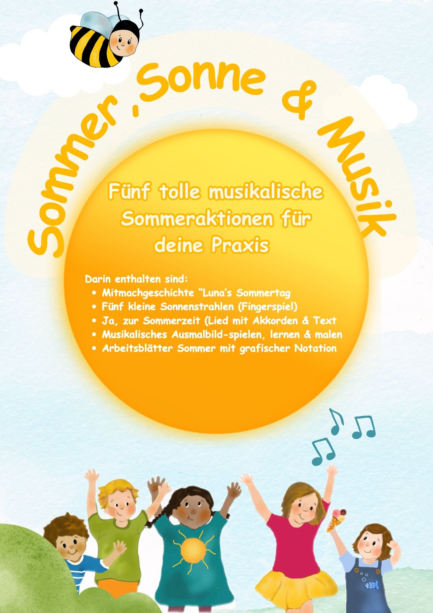 Du möchtest mit deinen Kindern in den Sommer starten? Auf 13 Seiten findest du vom Fingerspiel bis mehreren Arbeitsblätter eine bunte Palette an musikalischem Arbeitsmaterial, dass du unabhängig voneinander ohne große Vorbereitung nutzen und einsetzen kannst.